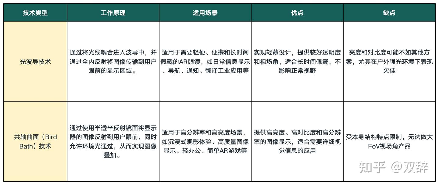 AR领域主流光学方案主要分为两类,一类是光波导(Waveguide),一类是共轴曲面(Bird Bath)。双辞把两种光学方案的特点整理成下表,大家可以参考一下: