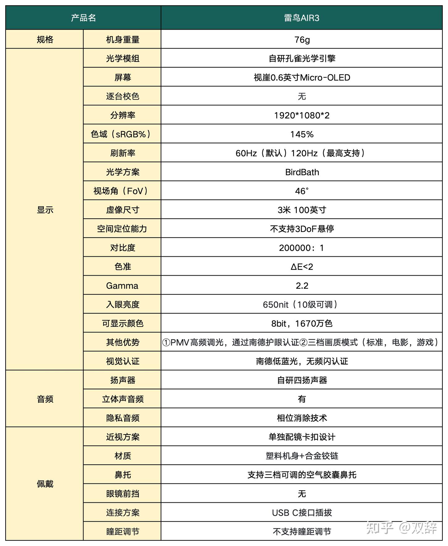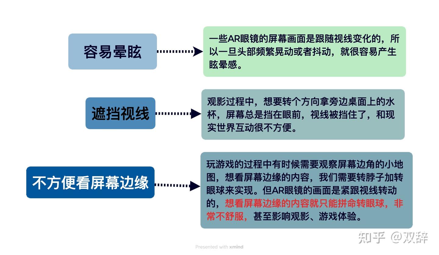 双辞自己经常长时间佩戴AR眼镜,感觉市面上这么多款AR眼镜,影响体验感的物理特质就包括重量、镜片、镜腿、鼻托。